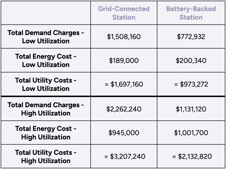 Conclusion: In the high utilization scenario, operating a grid-connected station will cost 50% more (over $1M) than a battery-backed station. With low utilization, a grid-connected station will face more than $700K in additional demand charges, a 95% increase in utility costs compared to a BESS station.