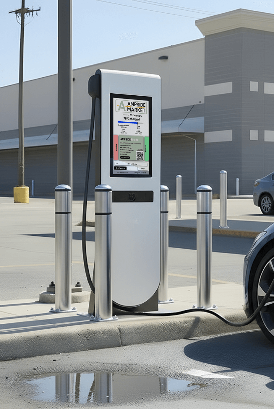 Interactive touchscreen for the ultimate retail-integrated charging experience.