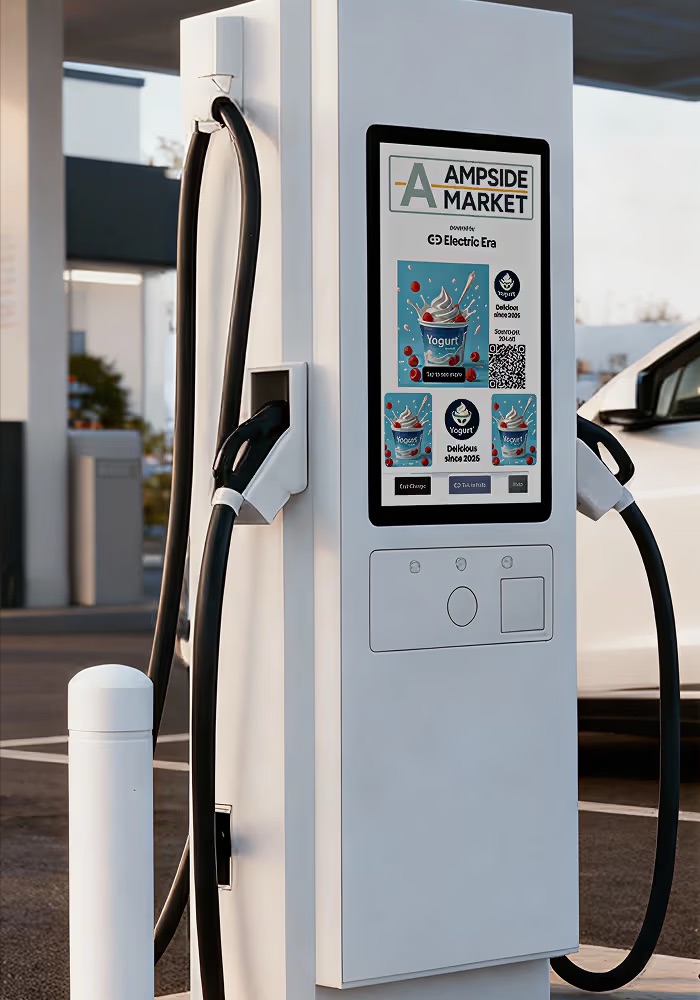 Every charger features a large interactive screen that seamlessly integrates with your existing retail media network, personalized promotions, and customer loyalty programs. This ensures that while drivers are charging outside, you are driving engagement and revenue inside.